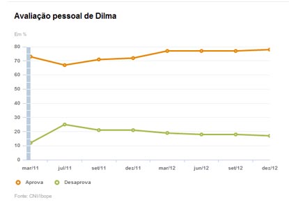 A aprovação do governo Dilma na primeira pesquisa do terceiro ano do primeiro mandato supera as aprovações obtidas por Lula e FHC em iguais períodos.