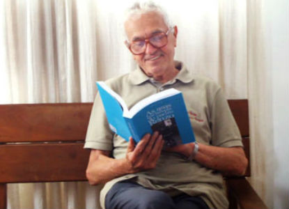 O padre Renzo Rossi folheia o livro que relata sua trajetória, de autoria do escritor Emiliano José (Foto: Murilo Gitel/EcoD)