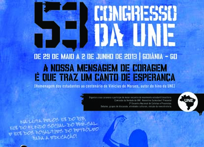 A identidade visual do 53º Congresso da União Nacional dos Estudantes (UNE), o maior fórum de discussão do movimento estudantil brasileiro, já está disponível para download no site da entidade como o cartaz, imagens para facebook e twitter, além de papéis de parede e outros elementos da arte, produzida especialmente para o encontro que será realizado de 29 de maio a 2 de junho de 2013 em Goiânia, no centro oeste do país.