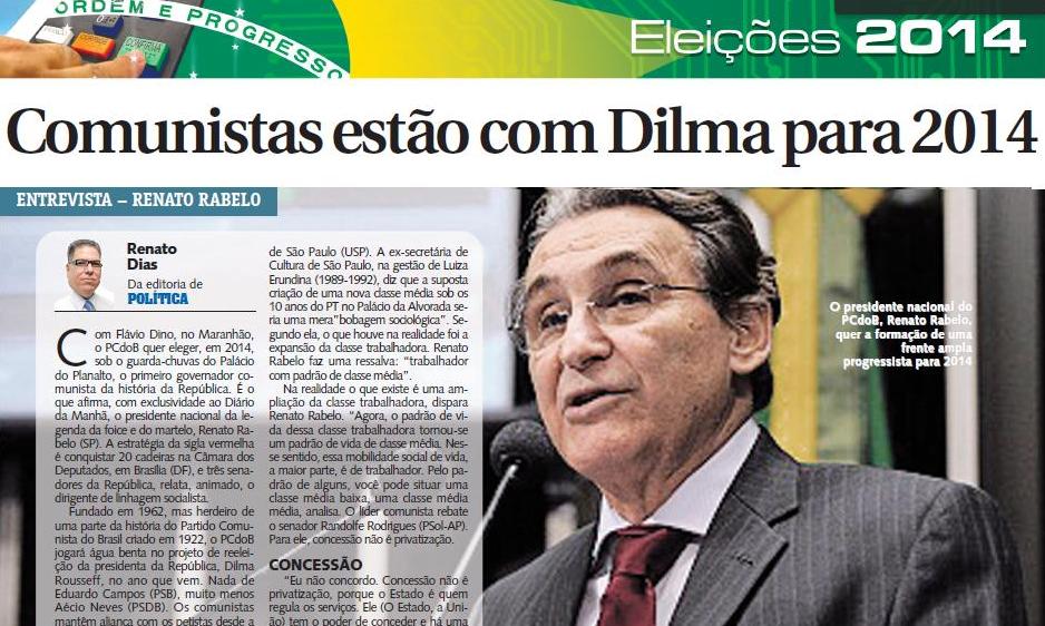 Fundado em 1962, mas herdeiro de uma parte da história do Partido Comunista do Brasil criado em 1922, o PCdoB jogará água benta no projeto de reeleição da presidenta da República, Dilma Rousseff, no ano que vem. Nada de Eduardo Campos (PSB), muito menos Aécio Neves (PSDB). Os comunistas mantêm aliança com os petistas desde a primeira eleição presidencial após o fim da ditadura civil e militar no Brasil, no ano de 1989. Eles integraram à época a Frente Brasil Popular, com PT e PSB.