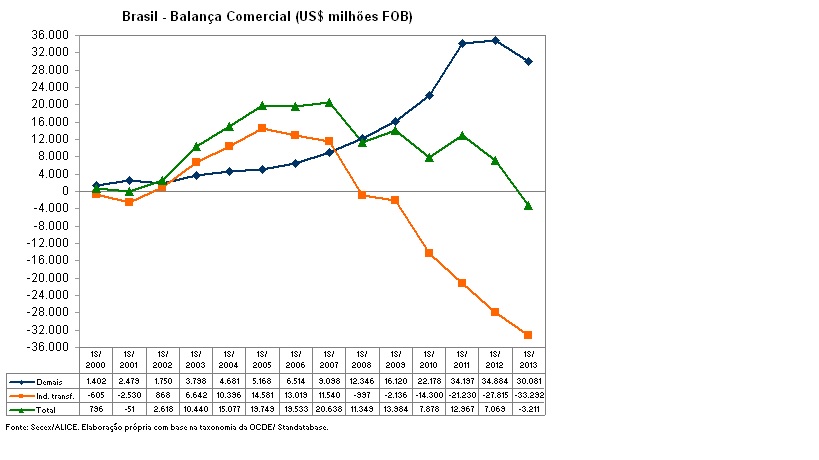 A balança comercial brasileira apresentou um déficit acumulado no primeiro semestre de 2013 de US$ 3,2 bilhões, o primeiro desde 2001 quando se apurou um déficit irrisório de US$ 51 milhões. Mas, a balança comercial vinha até então jogando um papel muito positivo nos anos anteriores. Analisando o gráfico apresentado pela Carta do IEDI de 19/07/2013 vê-se claramente que os crescentes déficits da balança dos produtos da indústria de transformação – um verdadeiro mergulho – acabaram por fazer negativa a balança comercial como um todo. Isto revela um problema muito mais profundo, resultado da desindustrialização e principalmente da sobrevalorização “estrutural” do Real frente ao dólar.