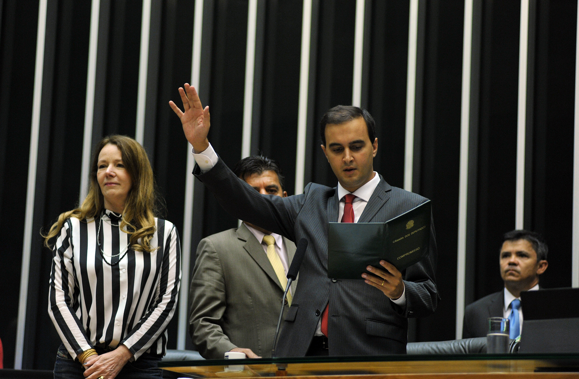 Antes de pronunciar o seu primeiro discurso como deputado federal, Gustavo Petta, de braço estendido, fez o compromisso oficial: “Prometo manter, defender e cumprir a Constituição, observar as leis, promover o bem geral do povo brasileiro e sustentar a união, a integridade e a independência do Brasil”.
