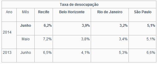 Em relação a junho de 2013, a taxa caiu 1,5% em São Paulo e 2,% no Rio de Janeiro, mantendo-se estável em Recife e Belo Horizonte.