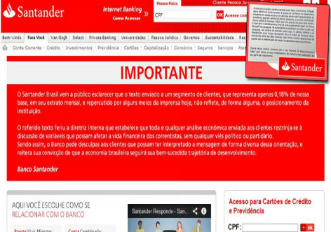 Após uma chuva de críticas dos correntistas do banco Santander, através das redes sociais e diretamente à empresa, o banco espanhol emitiu nota de pedido de desculpas à presidenta Dilma Rousseff e informou a demissão dos autores do”Extrato Inteligente”, o texto intitulado “Você e seu dinheiro”, com claro posicionamento contra a presidenta Dilma Rousseff.