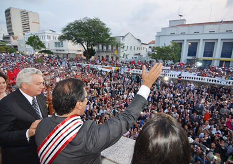 Flávio Dino na sacada do Palácio dos Leões saudando a multidão que acompanhou sua posse