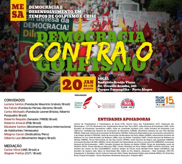 Mesa de Convergência durante o Fórum Social Temático, em Porto Alegre, discute Democracia contra o Golpismo, no dia 20 de janeiro, às 17h, no auditório Araújo Viana, no Parque Farroupilha.