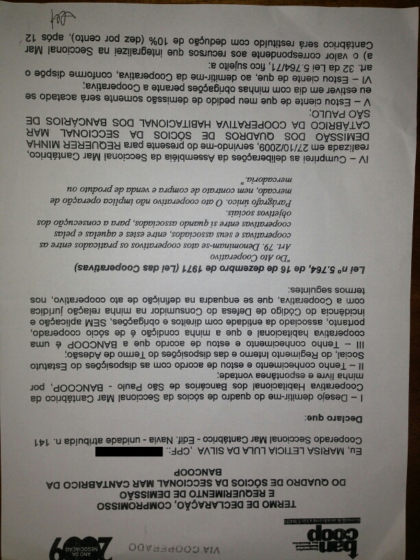 Marisa Letícia Lula da Silva assina o “Termo de Declaração, Compromisso e Requerimento de Demissão do Quadro de Sócios da Seccional Mar Cantábrico da Bancoop”.