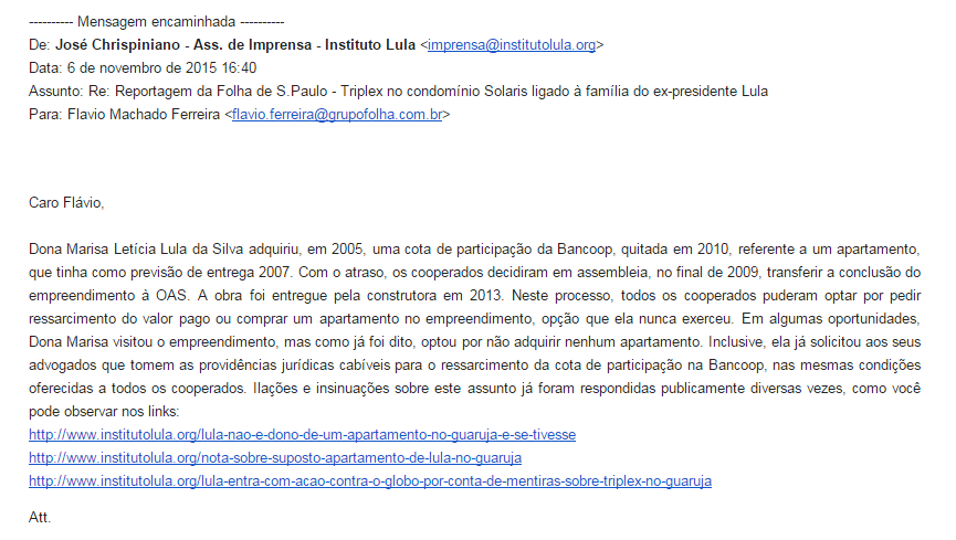 Durante esse período, além de esclarecer que Marisa Letícia era dona apenas de uma cota da Bancoop, a Assessoria de Imprensa do Instituto Lula sempre  informou aos jornalistas que a família estava avaliando se iria ou não comprar o imóvel.