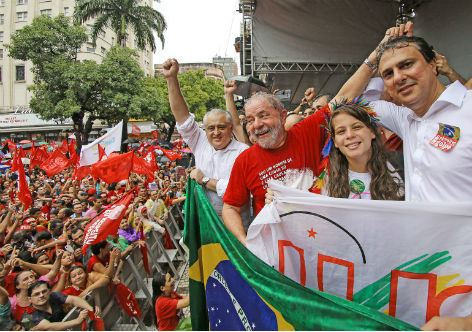 Lula, com o governador Camilo Santana e Germana Amaral, diretora da UNE, foi saudado pelos cearenses no centro de Fortaleza