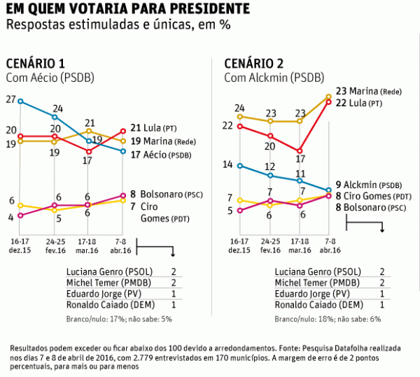 Se em março Lula estava atrás da candidata da Rede em todos os cenários, agora a situação é de empate. Marina Silva esta estagnada, oscilando na faixa dos 20 % nas pesquisas do Datafolha desde dezembro de 2015.