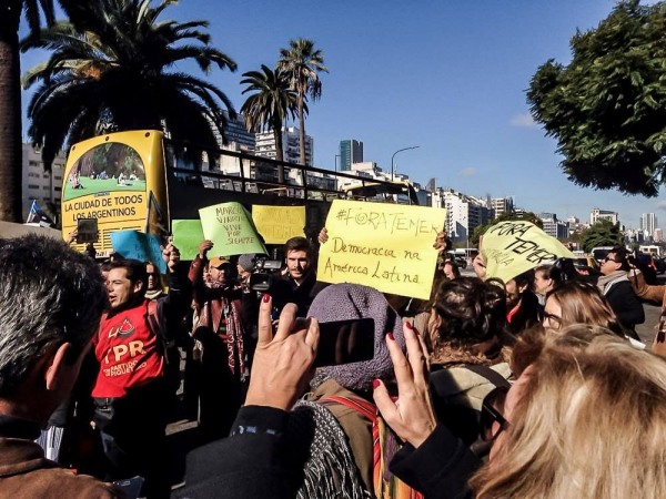 O Fora Temer desta sexta-feira ganhou o reforço de militantes nas cidades de Buenos Aires (Argentina), Berlim e Frankfurt (Alemanha). Através de cartazes bilíngues, manifestantes denunciam o golpe no Brasil liderado pelo presidente ilegítimo Michel Temer. O ato na Argentina foi realizado pelos participantes do VI Congreso da Ulapsi (Unión Latinoamericana de Entidades de Psicología). O protesto foi em frente a embaixada brasileira.