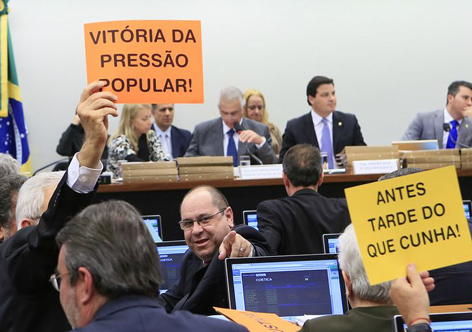 A votação, após algumas horas de debate, durou menos de meia hora e surpreendeu os presentes. A pressão popular – e os bastidores políticos – fizeram com que a deputada Tia Eron (PRB-BA) acabasse tendo que dividir os holofotes com Wladimir Costa (SD-PA), que depois de ter feito incontáveis defesas de Cunha, votou favorável ao parecer de Rogério.
