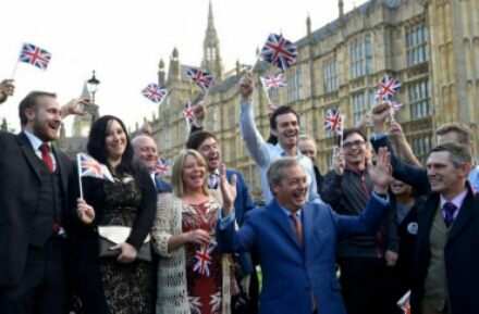 Nigel Farage, líder do UKIP, partido nacionalista e reacionário, celebra a vitória do Brexit