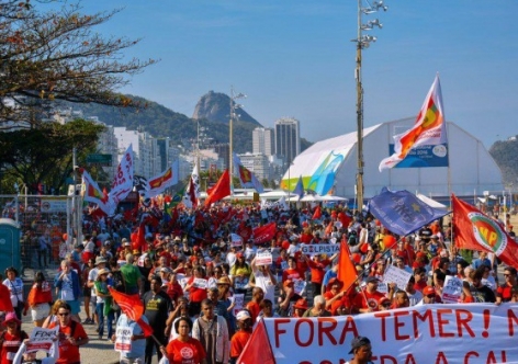 Milhares de pessoas participaram desde a manhã desta sexta-feira (5), no Rio de Janeiro, de uma manifestação para denunciar à comunidade internacional o golpe em curso no Brasil com o afastamento da presidenta eleita Dilma Rousseff e contra os retrocessos dos direitos do povo aplicados pelo governo interino de Michel Temer.