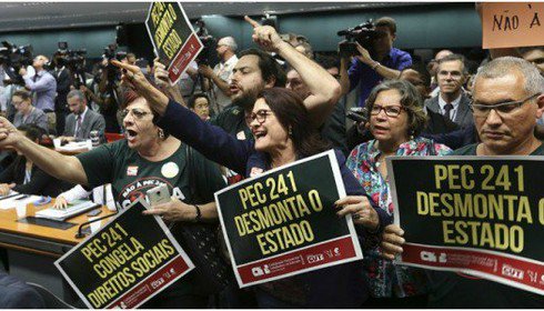 Diante desse cenário nos deparamos com a PEC 241/2016. E ela é, sem sombra de dúvida, a expressão mais cruel desse programa antipovo. Ora, congelar por 20 anos a despesa se referindo ao orçamento de 2017 — o orçamento sem povo e sem voto, instituído sem o crivo das urnas. Numa tacada só essa Emenda Constitucional quer retirar inúmeros marcos legais, inúmeras conquistas do povo brasileiro.