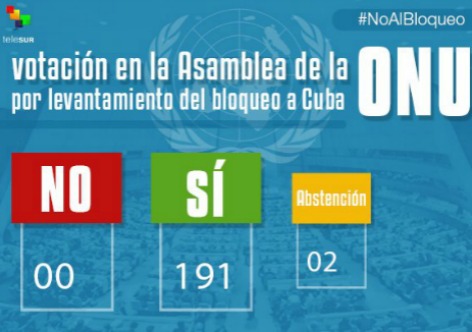 Com 191 votos a favor e apenas duas abstenções, Cuba obteve nesta quarta-feira (26) o respaldo dos países da ONU em sua luta contra o bloqueio econômico, comercial e financeiro que os Estados Unidos exercem contra a ilha há 54 anos. A comunidade internacional apelou em sucessivos discursos o levantamento do cerco aplicado pelos Estados Unidos durante mais de meio século.