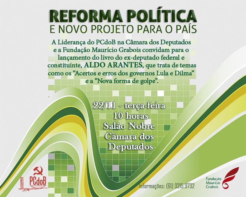 unnamed-2No ambiente do Salão Nobre da Câmara dos Deputados – no próximo dia 22 de novembro, às 10 horas — será lançado o livro “Reforma Política e Novo Projeto para o Brasil” escrito por Aldo Arantes, advogado, ex-deputado Constituinte de 1988, e deputado federal em várias legislaturas.