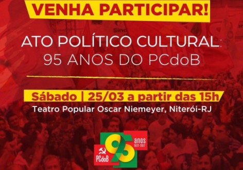 O aniversário de 95 anos do Partido Comunista do Brasil (PCdoB) comemorado neste sábado (25) mobiliza todo o Brasil pelo restabelecimento da democracia no país e contra o retrocesso nos direitos sociais. Os atos estão sendo realizados em vários estados. O PCdoB está mobilizando seus militantes, parceiros políticos e amigos para um grande ato político cultural na cidade em que o Partido foi fundado em 1922, na cidade de Niterói, no Rio de Janeiro.