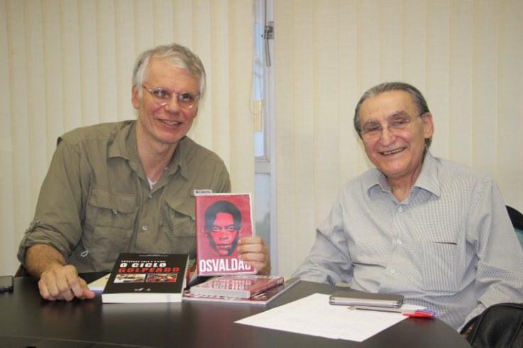 Sicsu recebe cópia do filme Osvaldão, que pediu por ter ficado impressionado ao assistir no cinema. Renato Rabelo também ofereceu o livro com análise do “ciclo golpeado” de Lula e Dilma. Foto: Cezar Xavier