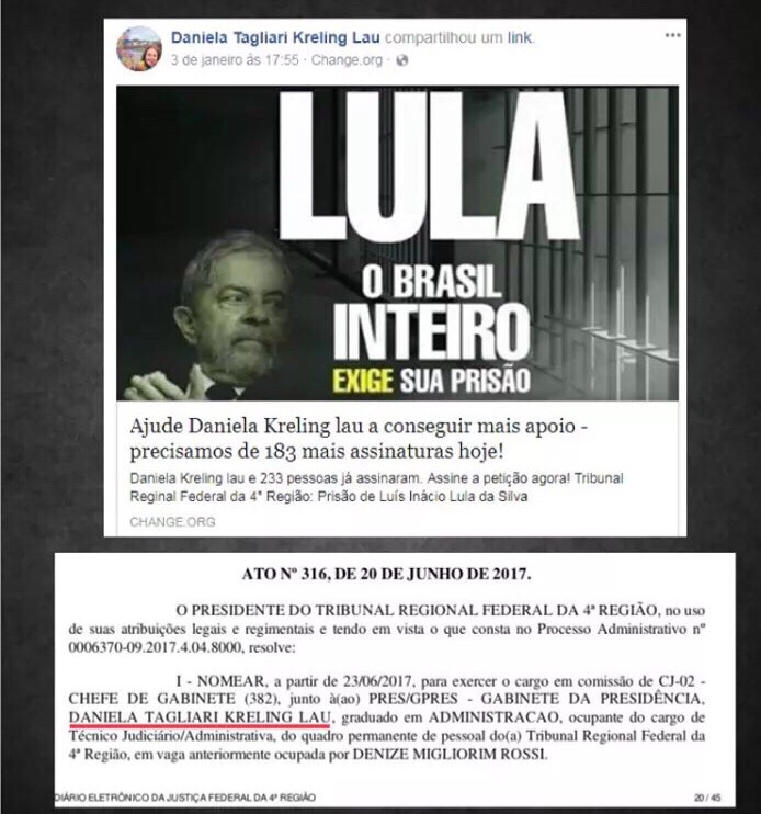 Ela cita nominalmente o caso de Daniela Tagliari Kreling Lau, que por meio de uma postagem no Facebook expressou “seu desejo de ver Lula na cadeia”. Daniela é chefe de gabinete da Presidência do TRF-4, desembargador Carlos Eduardo Thompson Flores Lenz.