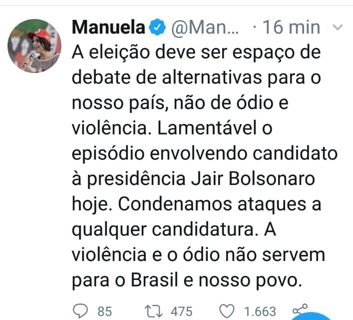 A deputada federal Jandira Feghali (PCdoB-RJ), candidata à reeleição, condenou o acontecimento. “Somos contra qualquer ato de violência e de ódio. A luta política e o embate eleitoral devem estar na disputa de ideias”. A parlamentar defendeu que se apure o ocorrido com o candidato Jair Bolsonaro.