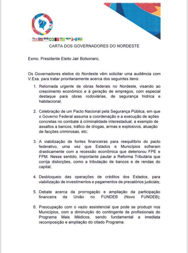 O documento faz referência a preocupação dos municípios com a saída dos cubanos do Programa Mais Médicos e pedem a retomada imediata do projeto, destacam a necessidade de celebrar um Pacto Nacional Pela Segurança Pública, pedem o desbloqueio de operações de crédito para viabilizar investimentos e cobram a retomada urgente de obras de infraestrutura no estado, visando a geração de emprego e crescimento econômico.