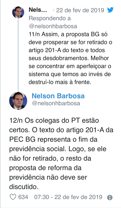 “Melhor se concentrar em aperfeiçoar o sistema que temos ao invés de destruí-lo mais à frente”. O economista, conclui que se esse dispositivo não for retirado da PEC, “o resto da proposta da reforma não deve ser discutido”. A seguir, veja a série de Tweets: