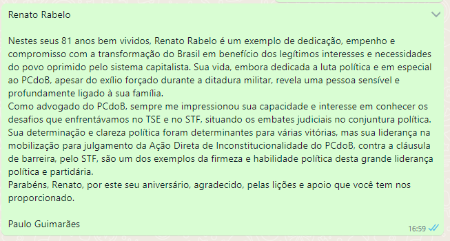 Hoje quero parabenizar um amigo, um líder e um exemplo: meu camarada @renatorabelobr. Tenho a honra de militar ao lado de uma figura ímpar na nossa história política. Meu amigo Renato sinta-se abraçado neste seu aniversário de 81 anos, um grande abraço para você e para a Conchita