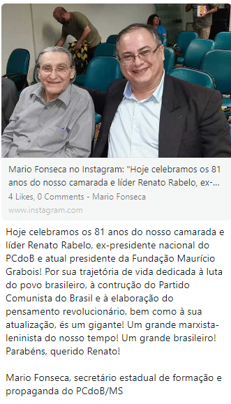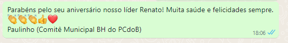 Hoje quero parabenizar um amigo, um líder e um exemplo: meu camarada @renatorabelobr. Tenho a honra de militar ao lado de uma figura ímpar na nossa história política. Meu amigo Renato sinta-se abraçado neste seu aniversário de 81 anos, um grande abraço para você e para a Conchita