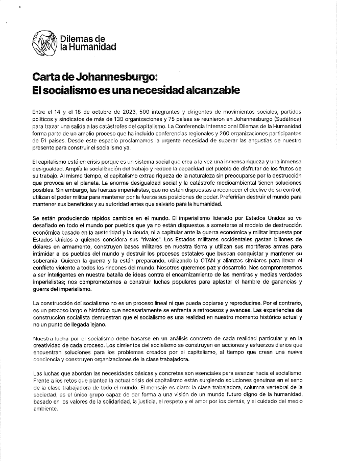 A reunião foi encerrada com a aprovação por consenso da “Carta de Johannesburgo”, um documento guia para a unidade dos movimentos sociais, sindicatos de trabalhadores e centrais sindicais e partidos políticos de esquerda: “O socialismo é uma necessidade alcançável”, é o lema da Carta.
